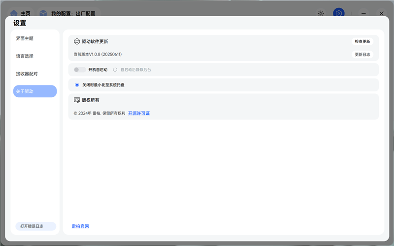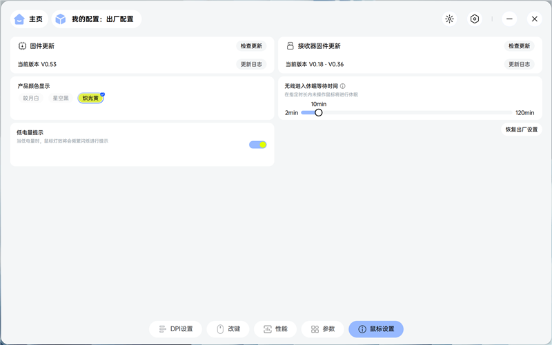 在鼠标设置中,可以检查鼠标本体和接收器的固件更新,首页显示的产品图片的颜色,其实是需要在这里手动选择的,目前还不能自动识别出产品颜色。