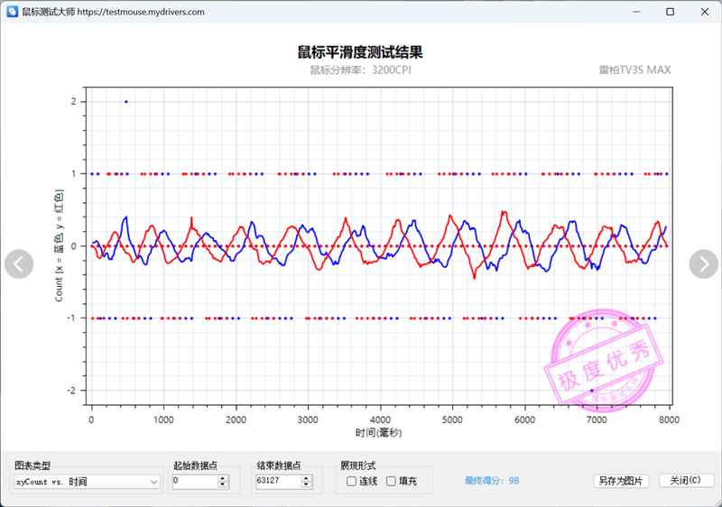 在鼠标测试大师的鼠标平滑度测试中,雷柏vt3s max鼠标很轻松就能获得极度优秀的评价。