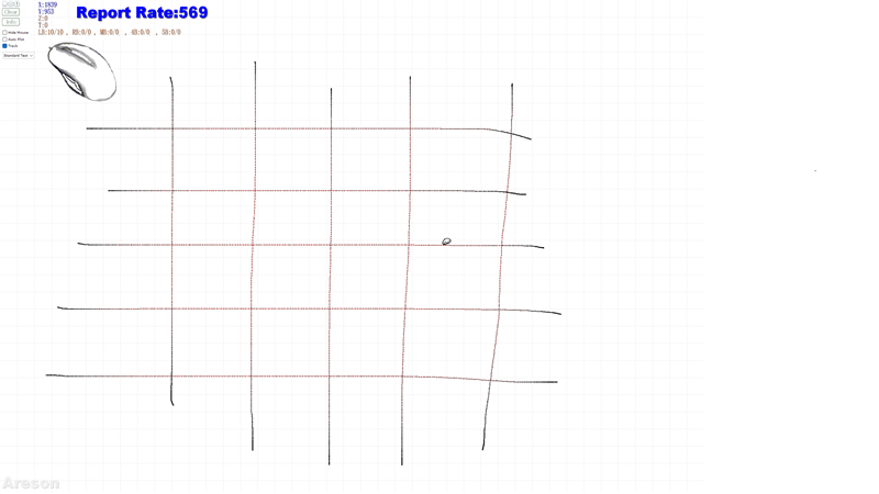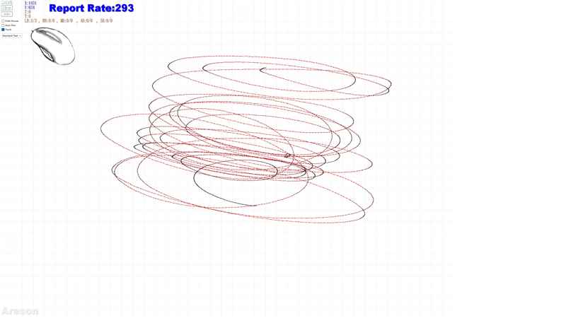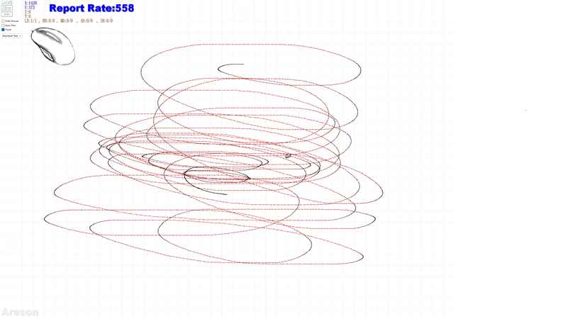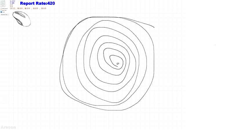 在a-hub中打开直线修正和波纹修正功能,可以看到在快速晃动鼠标画圈时,一些比较平直的部分被软件修正成了直线,直线测试中鼠标移动速度较快的部分,也都被修正过,玩家可以根据自己的需要选择是否开启软件修成功能。