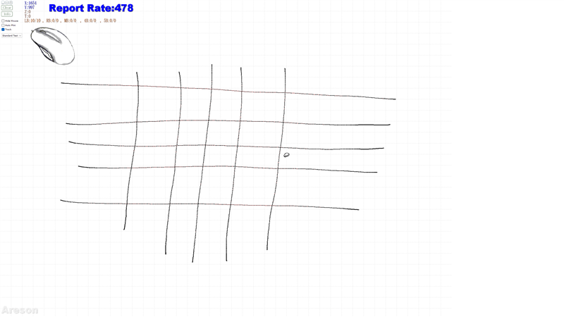 在a-hub中关闭鼠标的直线修正和波纹修正功能,使用mousetest软件测试雷柏vt3s max的操控性能,可以看到得益于8khz的超高回报率,即使是极快的抖动鼠标划线,依旧可以保持线条的流畅,对鼠标移动的追踪非常精确,同时也会导致画直线时手的抖动也被忠实记录下来。