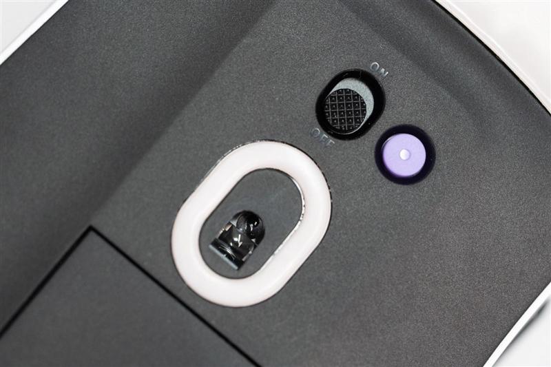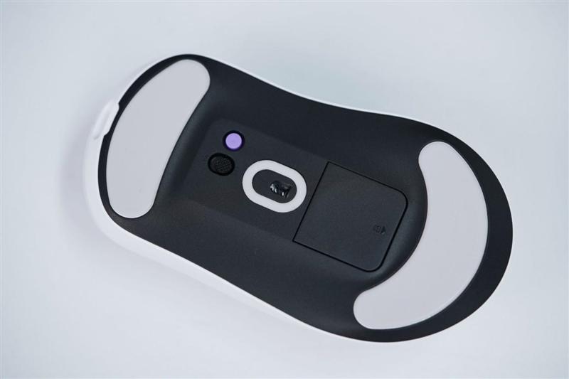 鼠标底部开关和传感器窗口特写,底部的紫色diy按钮默认是回报率切换功能,玩家也可以修改为其他功能。