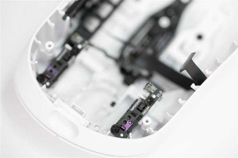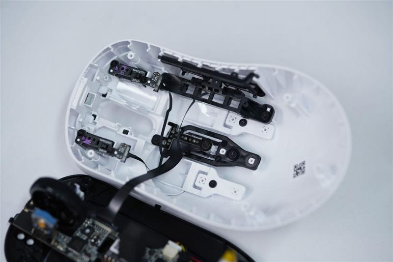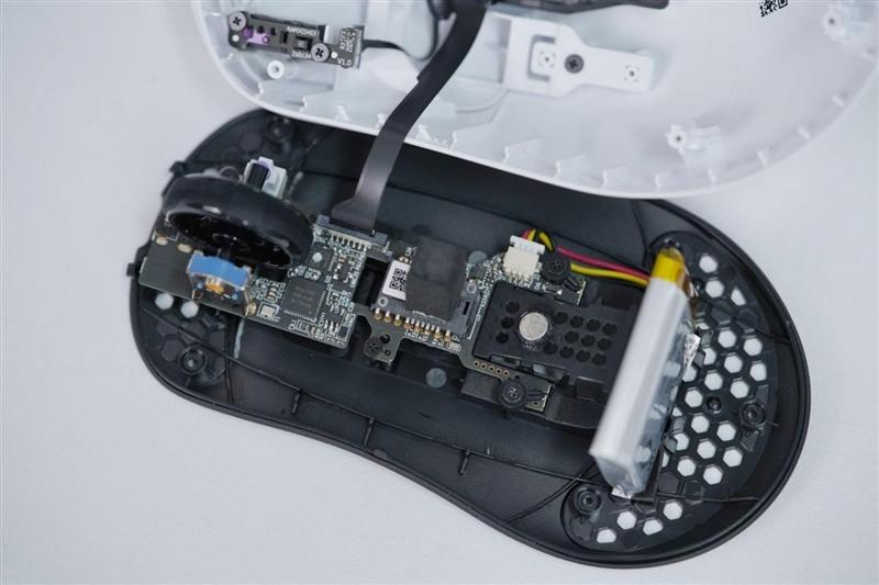 可以看到雷柏vt3 max鼠标内部设计极度精简,电路板几乎是沿着芯片形状进行了切割,最大限度进行减重,上下盖元件之间大量使用软排线连接,鼠标内部十分空旷,非常方便用户自行改造。