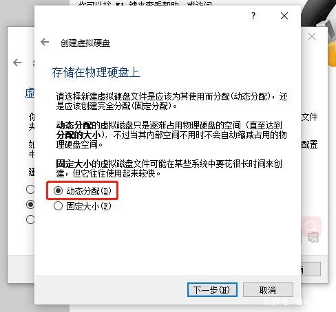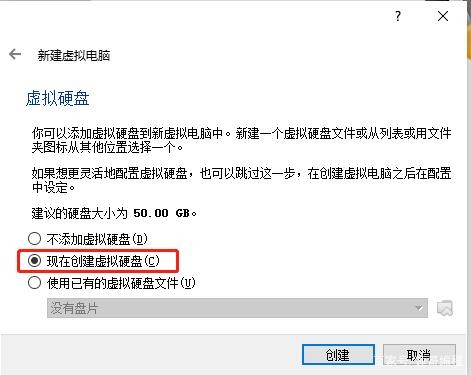 设置硬盘:主要是选择是否现在创建,大小,一次性分配空间还是根据存储内容动态扩容(但受到设置的最大值和物理机的限制)。