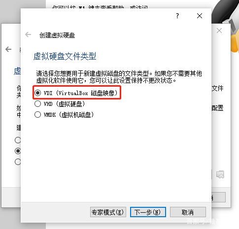 选择硬盘文件类型。vdi是只能virtualbox使用,下面的两个也可以在vmware workstation中使用。