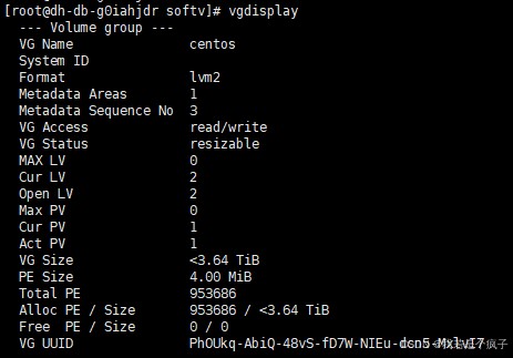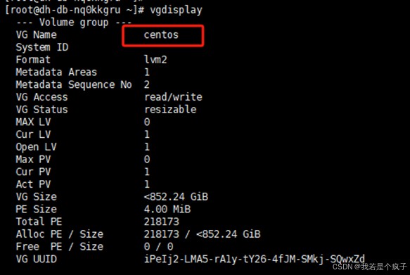 输入 vgdisplay 查看所属卷组,每个服务器不一样,这里 vg name 为 centos。
