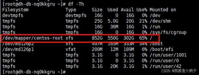 在查看新增磁盘之前可以先查看目前系统磁盘空间。此时我们存储空间为 852g,且我这里的文件系统为xfs。