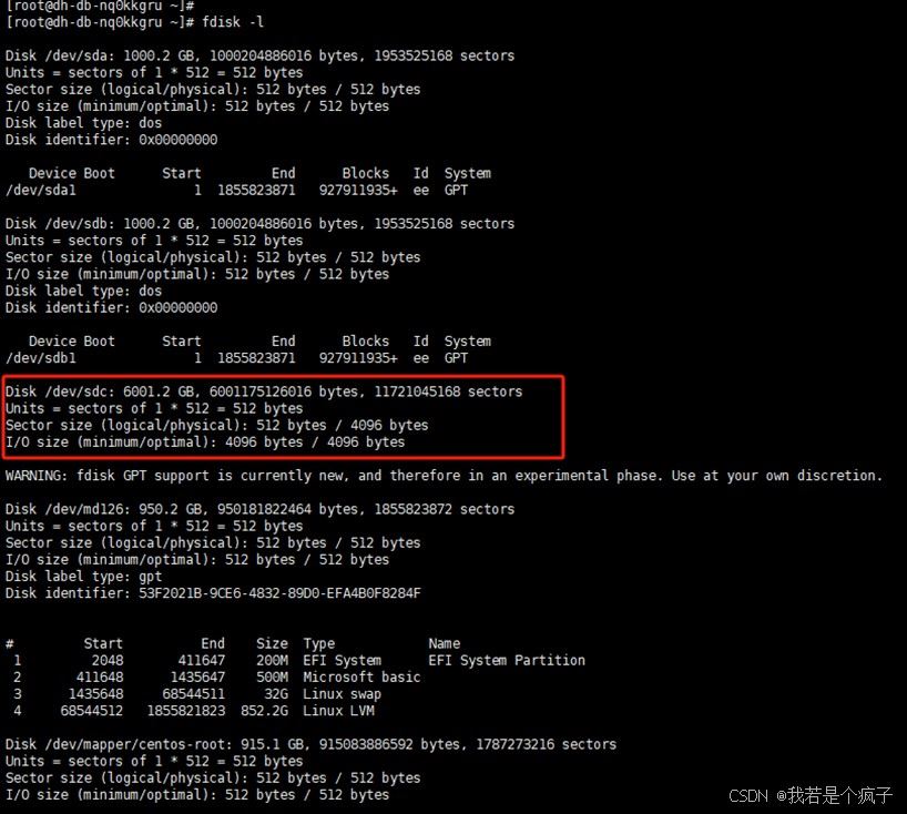 新增磁盘插入卡槽后,输入 fdisk -l 查看磁盘名,这里我的新磁盘为 /dev/sdc 。