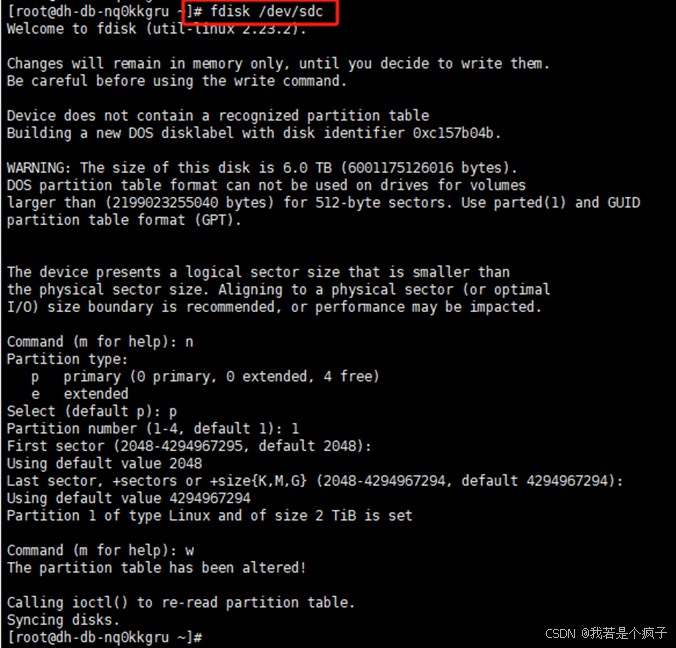 输入fdisk /dev/sdc(磁盘名按照实际情况修改)进行磁盘分区,输入n p 1,(n为新建分区,p为选择主分区,1为分区编号),然后两次回车,将全部容量分配给sdc1(注意这里分配空间只适用于2t以内)。