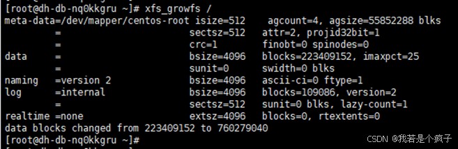 将文件系统扩大,用 xfs_growfs 命令,centos7 默认文件系统是 xfs 的。