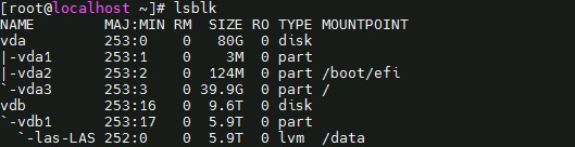 首次创建逻辑卷(名称为las的lv)的时候,已经将vg(名称为las)、pv、分区(/dev/vdb1)的所有空间占满了,之后对/dev/vdb进行了扩容,进而完成对lv的扩容。