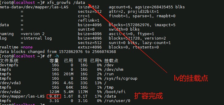 xfs_growfs /data ###/data是lv的挂载点,若是别的文件系统需要使用对应的命令