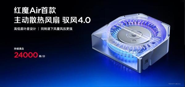 不止于此,红魔11 air的另一大杀手锏是主动散热,这是唯一内置主动散热风扇的air手机,这次红魔11 air升级到了主动散热风扇驭风 4.0,实现了24000转/分的可持续转速,采用高低叶差叶片设计,在机身内部打造全新高效散热通路,将核心热量快速导向风扇散出。