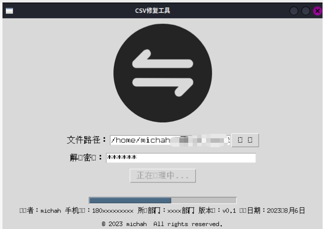 development_date_label = tk.label(root, text="开发者:michah 手机号码:180xxxxxxxxx 所属部门:xxxx部门 版本号:v0.1 开发日期:2023年8月6日", font=("微软雅黑", 10))