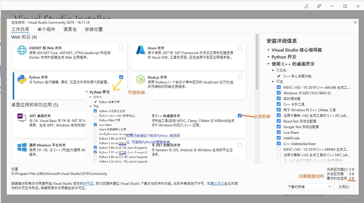 启动visualstudiosetup.exe, 必须选择c++开发, 可选python开发, 点击安装。