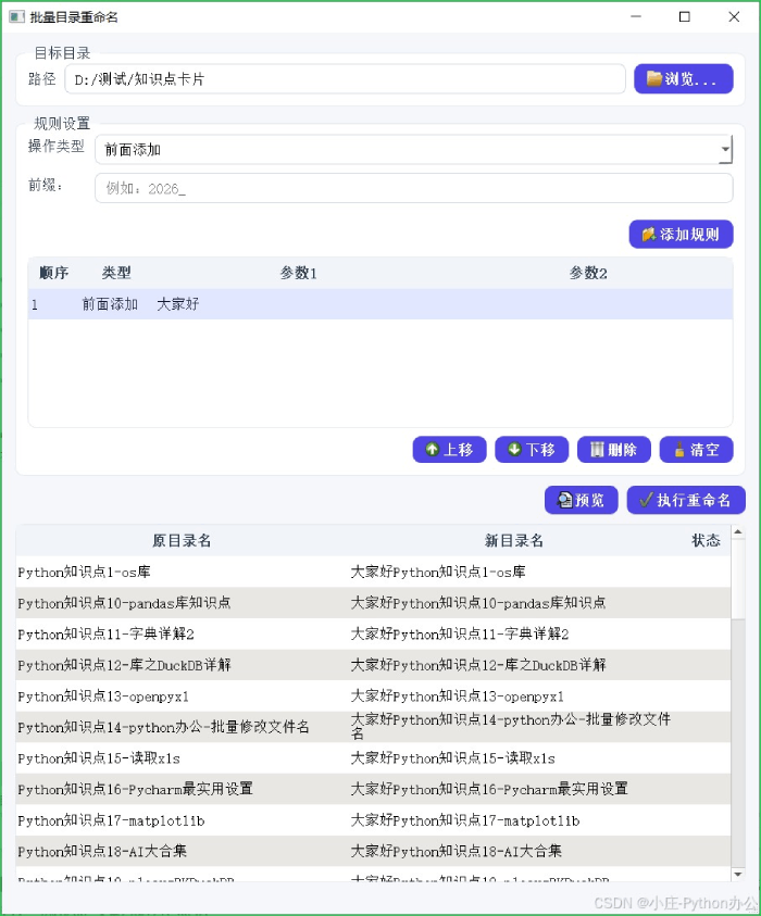 - 一个下方表格,显示「原目录名」「新目录名」「状态」