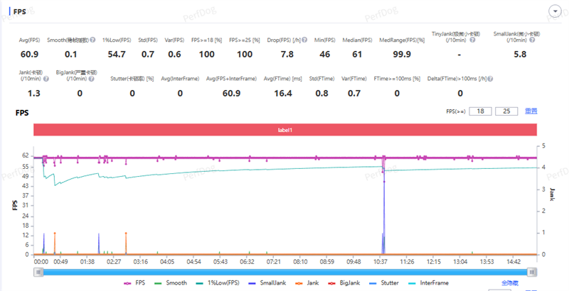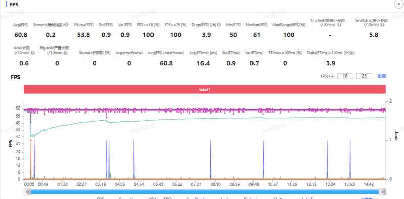 这次在红魔11 air上的表现也不意外,游戏平均帧数为60.0fps,稳帧指数0.1。1%low帧达到了54.7fps。游戏甚至比王者荣耀更稳。