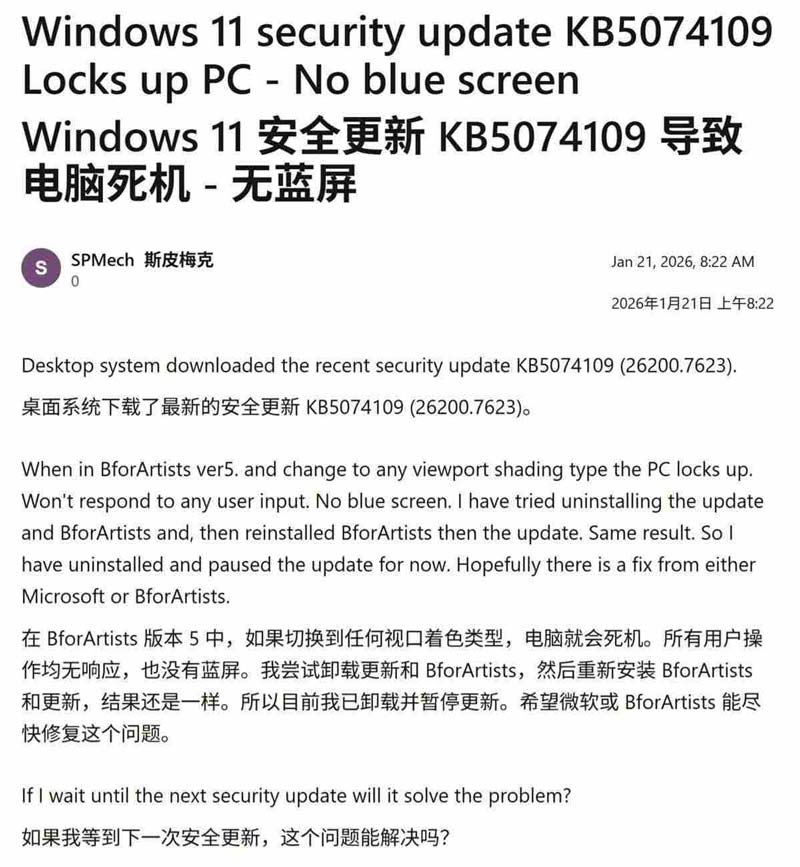 据该用户描述,只要在软件中切换“视图着色(viewport shading)”模式后,pc 便会立即卡死,无法响应任何指令,且未显示蓝屏错误代码。spmech 尝试卸载并重装软件均未奏效,唯有卸载 kb5074109 更新后系统才恢复正常。
