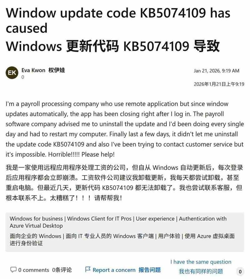 除图形处理领域外,企业级应用也未能幸免。用户 eva kwon 报告称,其薪资管理及远程访问应用程序在安装更新后,会在登录瞬间立即关闭。