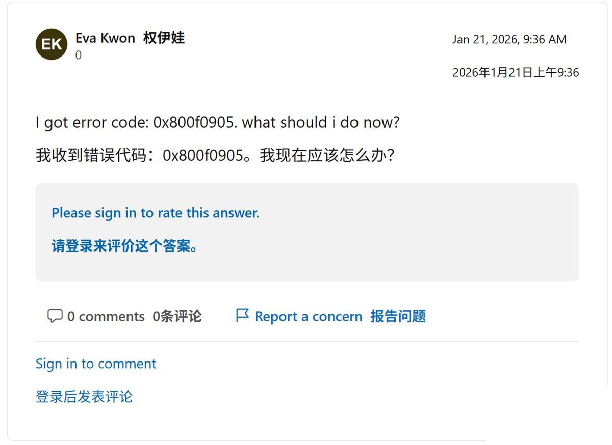 更为棘手的是,当该用户试图按照常规手段卸载 kb5074109 以恢复业务,发现无论是通过标准系统设置还是进入“安全模式”,均无法成功移除该补丁,根据提示操作跳出“0x800f0905”错误。