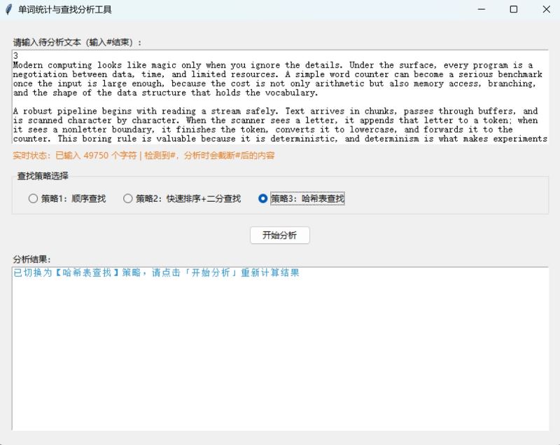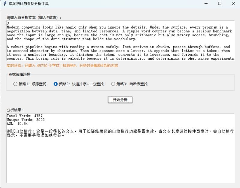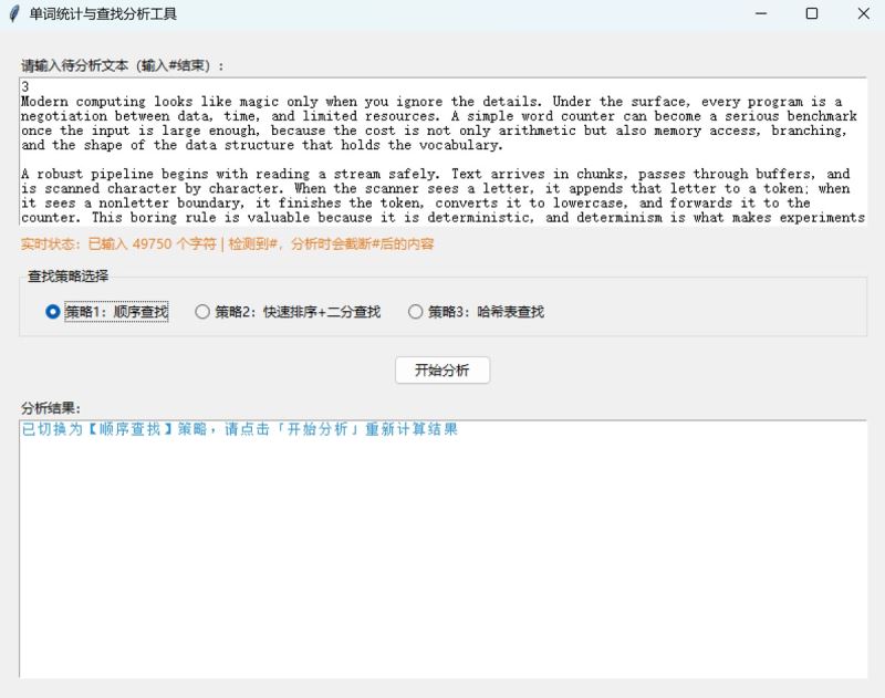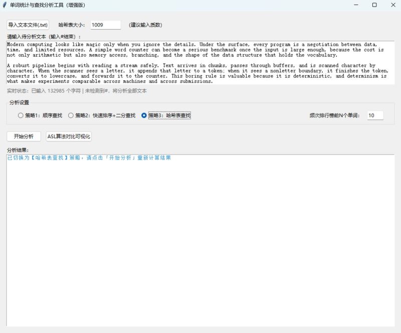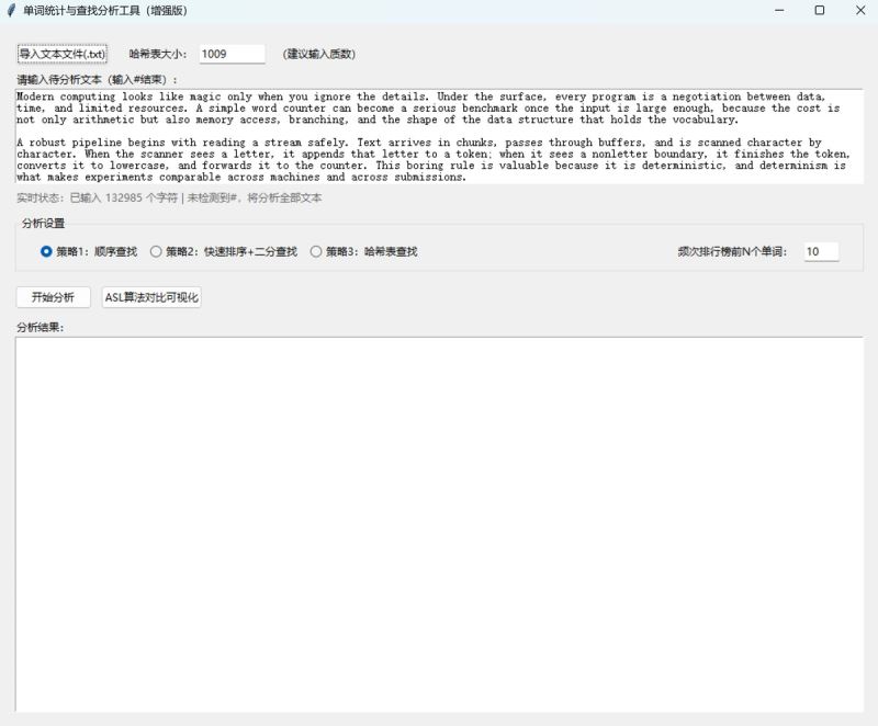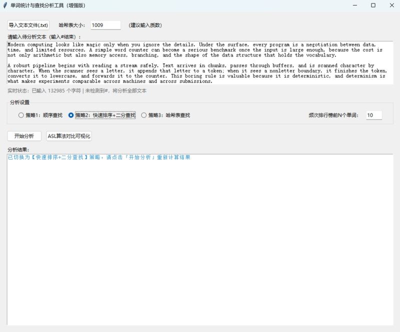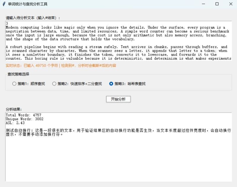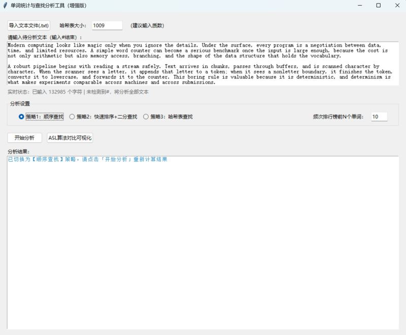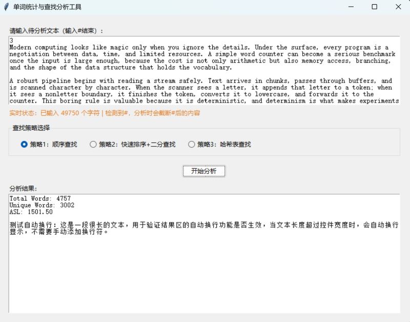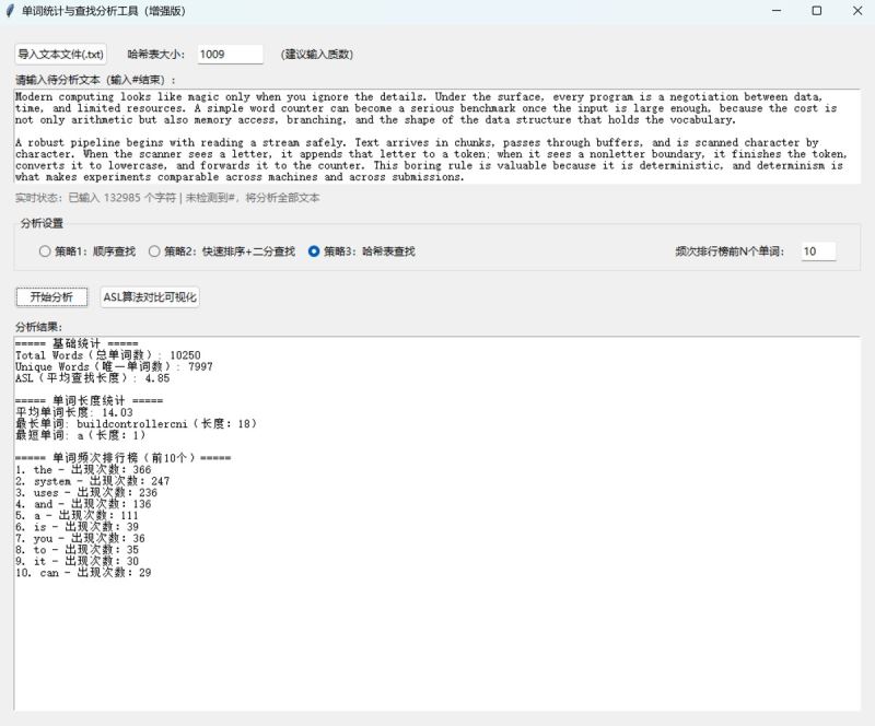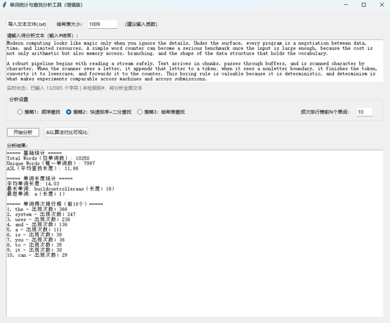 本文介绍了一款单词统计与查找分析工具的设计与实现。该工具支持三种查找策略(顺序查找、快速排序+二分查找、哈希表查找),可计算文本中的单词总数、唯一单词数和平均查找长度(asl)。工具采用python开发,包含核心算法层和gui交互层,具有文本标准化处理、实时状态提示和多策略对比功能。扩展版新增了文件导入、单词长度统计、频次排行榜和asl可视化等功能,支持自定义哈希表大小。文章详细阐述了工具的技术选型、架构设计、核心算法实现和测试优化过程,并提供了完整的python代码实现和打包方法。