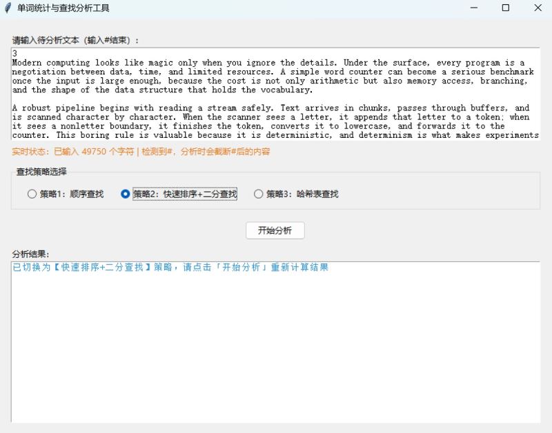 #结束符检测;策略切换即时反馈,结果格式化展示; - 鲁棒性:处理空文本、超长单词、无字母文本等边界场景,避免崩溃;