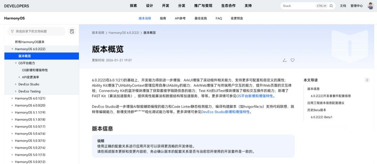 | api 版本 | release | 6.0.2(22) * 注意:设备系统支持的 api 能力范围请以 api 版本为准。 | 2026/01/21 |