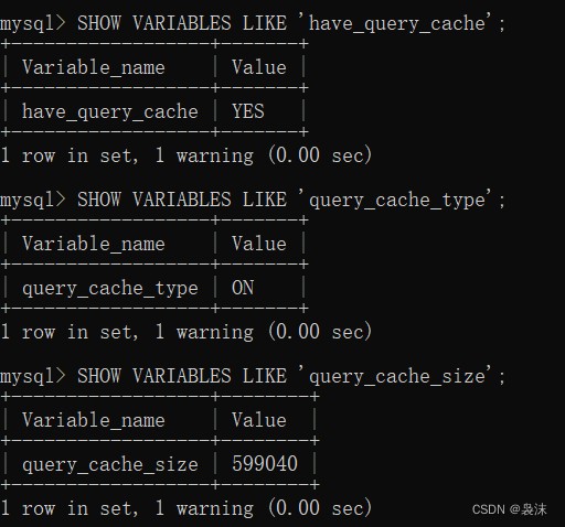-- 查看是否支持缓存 show variables like 'have_query_cache'; -- 查看是否开启缓存 show variables like 'query_cache_type'; -- 查看缓存所占空间大小 show variables like 'query_cache_size';