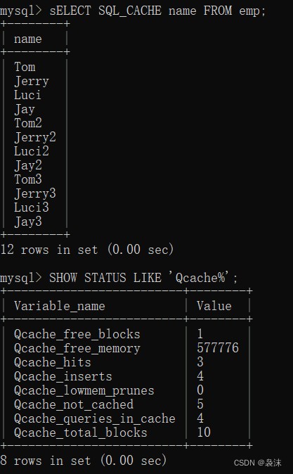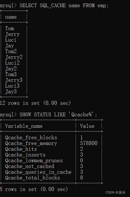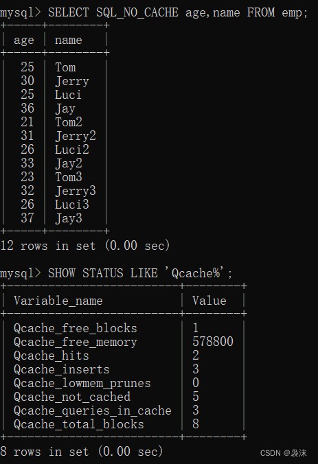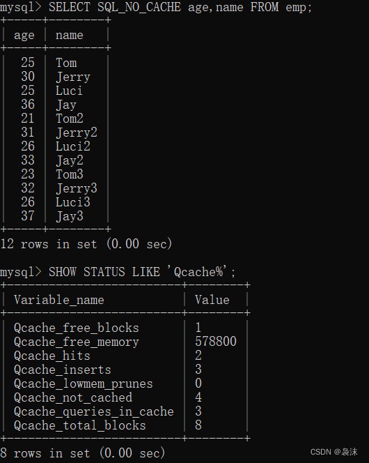 select sql_cache name from emp; select sql_no_cache age,name from emp;
