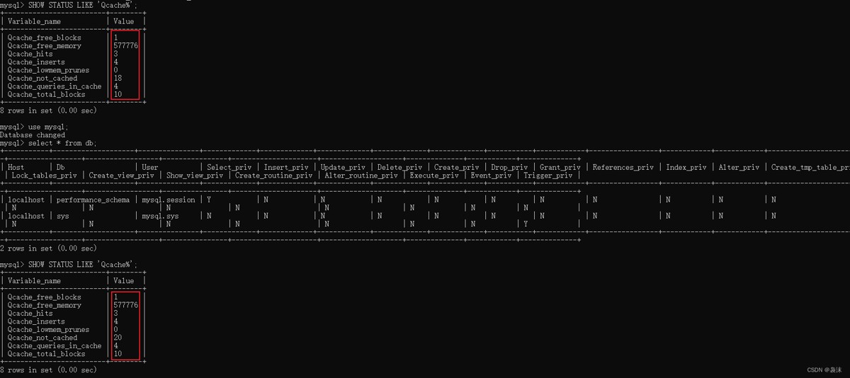 4) 查询 mysql, information_schema或 performance_schema 数据库中的表时,不会走查询缓存。(系统数据库)