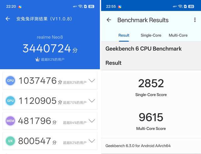 性能是真我neo8的核心竞争力,第五代骁龙8旗舰芯与行业唯一极客性能面板的组合,带来行业最自由的性能释放。硬件层面,该芯片采用第五代骁龙8至尊版同款台积电3nm制程与2×3.8ghz+6×3.32ghz全大核架构,搭配lpddr5x内存与ufs4.1闪存组成性能铁三角,实测在安兔兔v11版本跑分轻松突破344万分,远超同档机型。