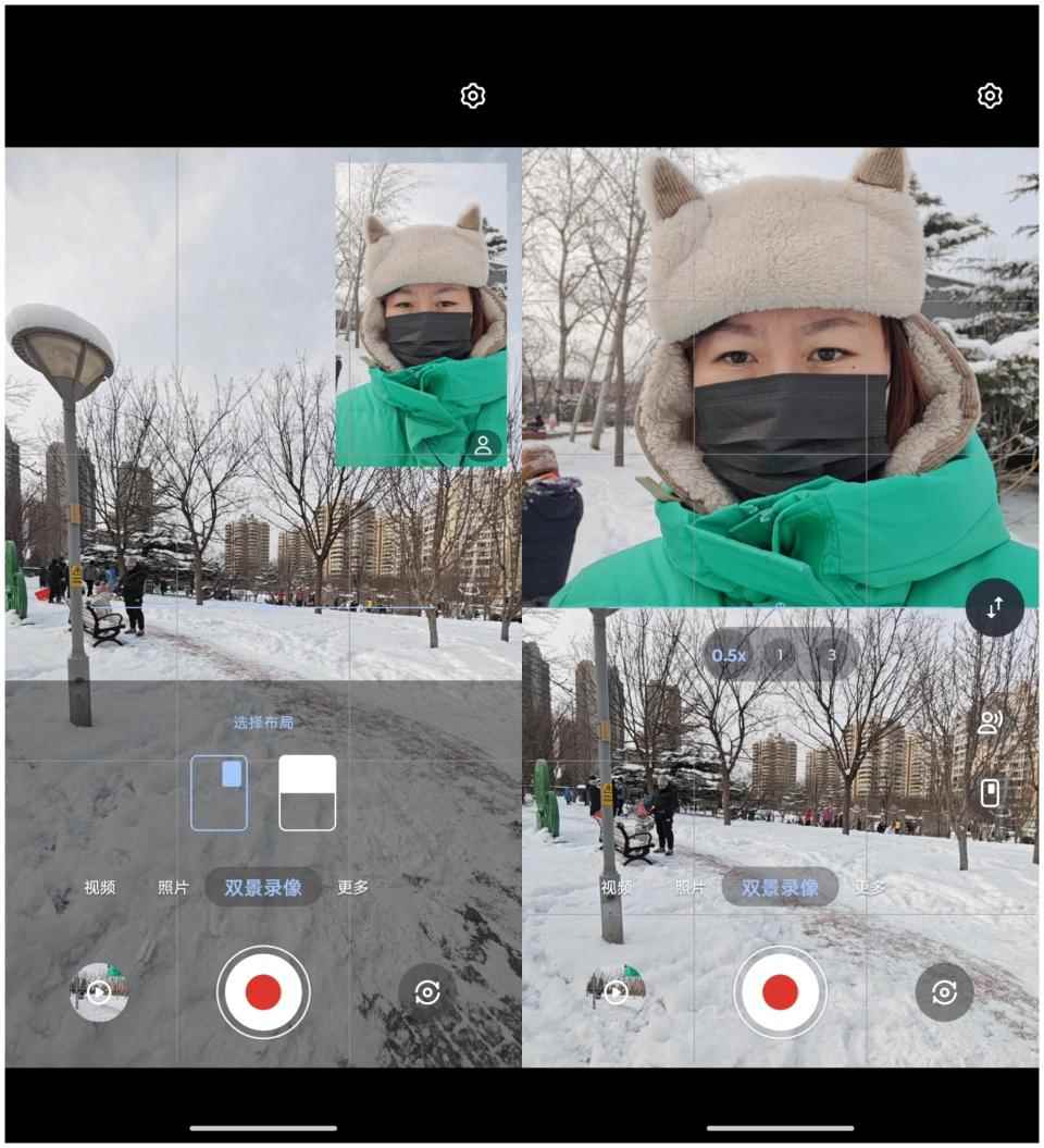 在双景vlog拍摄时,支持前后摄画面的互换,并且可以调整画面布局,在录制时,声音也可以自动调整为双景模式,前后声音都清晰,配合更稳定的防抖表现,可以创作出更有意思的视频内容。