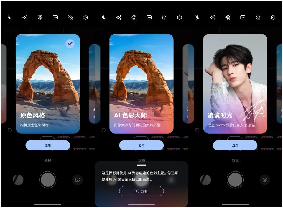 联想moto x70 air pro还在影像中加入了很多ai技术,通过ai色彩大师可以调整照片的色彩,让照片看起来更加鲜活。当然,你也可以选择凌境时光的色彩风格,代言人张凌赫同款,也很适合拍摄人像。
