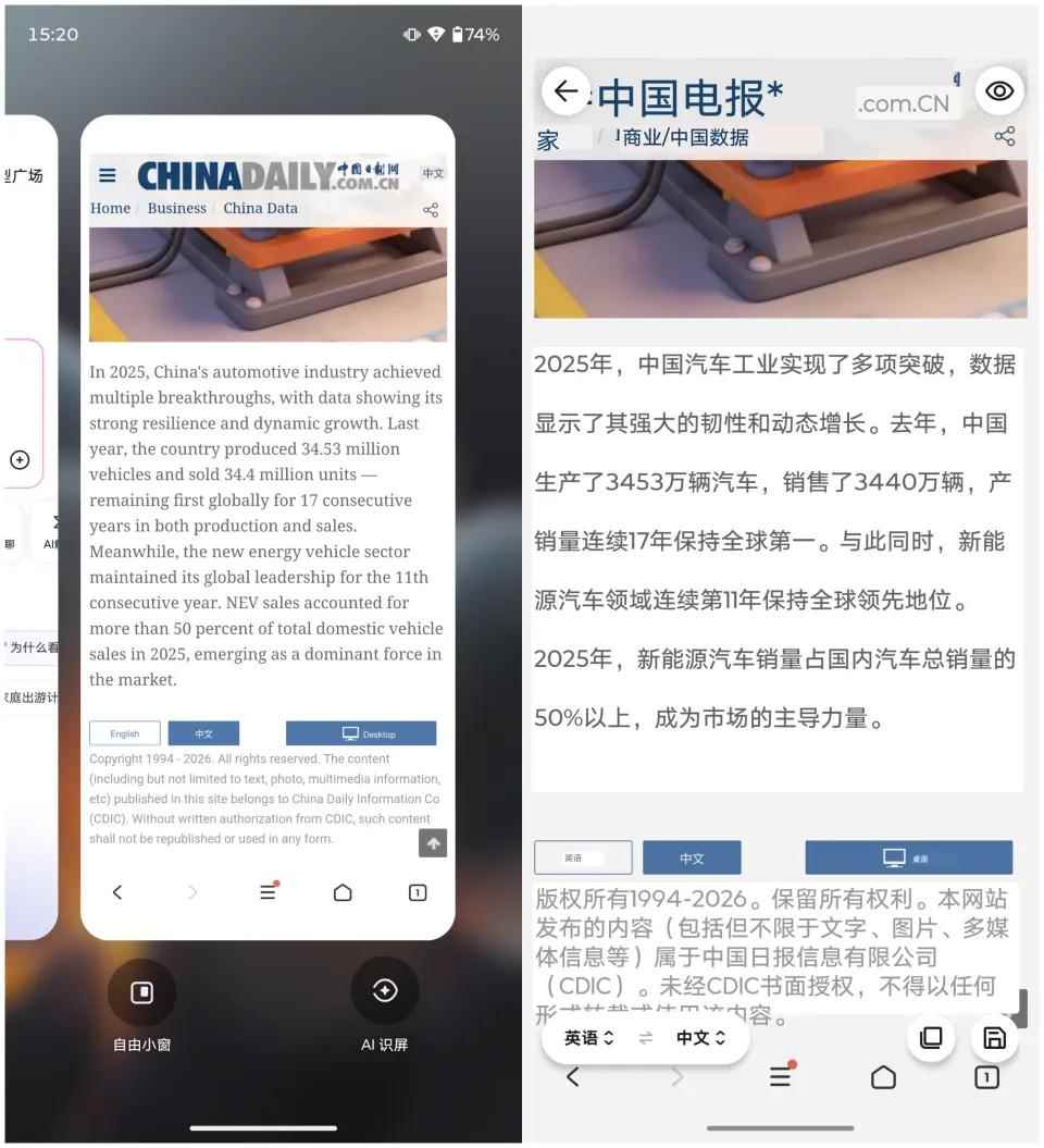 ai识屏2.0也带来了很多新的功能,比如在阅读公众号内容时,可以利用 ai识屏进行内容的快速总结,节省阅读的时间。在浏览小红书的时候,也能够使用这个功能来进行图片搜索,在电商平台快速找到对应的产品进行购买。如果是阅读英文文献,也能够使用ai识屏来实现页面的翻译功能,帮你扫除阅读障碍。