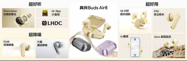 同步发布的还有真我 buds air8 耳机,299 元的价格,首销减 30,搭配手机买再减 30,239 元就能拿下。11mm+6mm 分频双单元,支持 hi-res 认证,音质媲美高端耳机;55db 深海级降噪,不管是坐飞机还是坐地铁,都能隔绝外界噪音。还支持 30 种语言实时互译,58 小时续航,ip55 防尘防水,性价比超高。