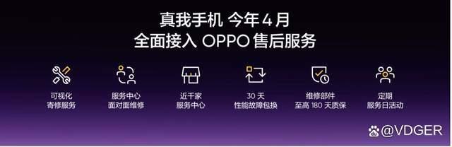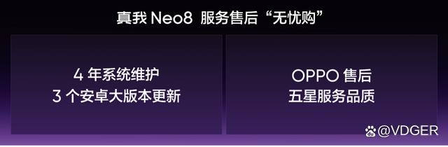 售后服务也让人放心,真我今年 4 月会全面接入 oppo 售后体系,全国近千家服务中心,能享受面对面维修、可视化寄修这些服务。真我 neo8 还承诺 4 年系统维护和 3 个安卓大版本更新,用个四五年系统依然流畅,30 天性能故障包换,维修部件最高 180 天质保,买得放心用得舒心。