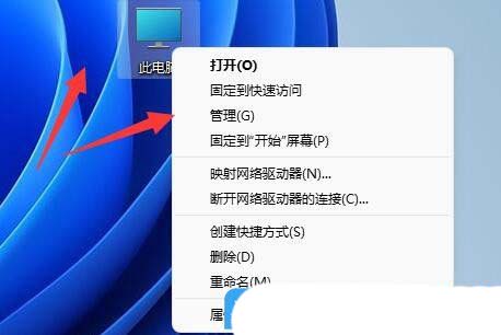 1、桌面右键点击此电脑,在打开的菜单项中,选择管理;