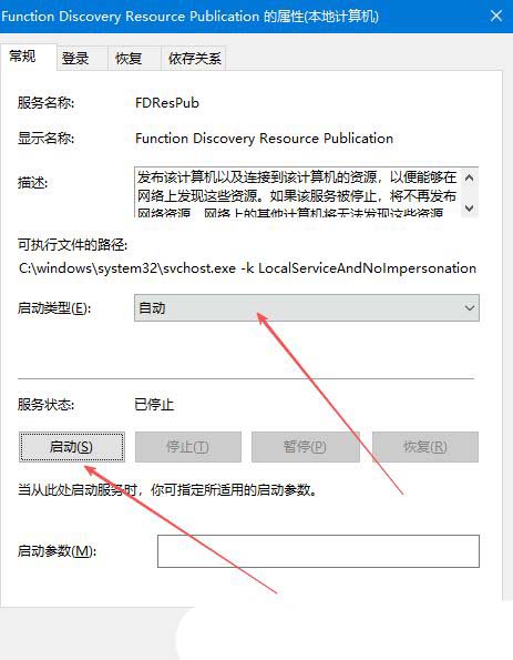 4、function discovery resource publication 的属性窗口,更改启动类型为自动,服务状态如果是已停止,还需要点击启动,最后按确定保存即可;