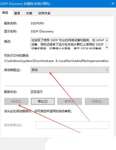 6、ssdp discovery的属性窗口,更改启动类型为自动,最后按确定保存即可;