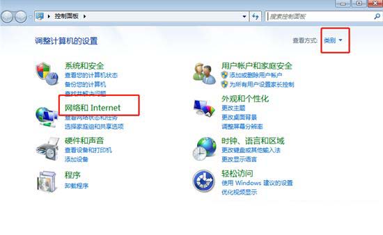 2、接着,在打开的界面中,设置“查看方式”为“类别”,再选择进入到“网络和internet”。