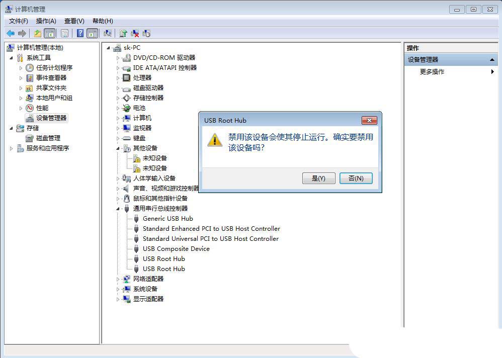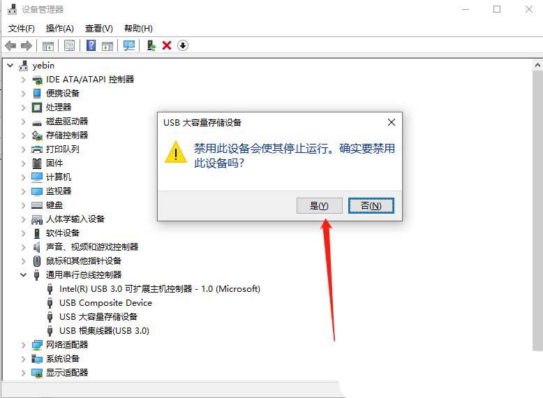 4、弹出提示框中,点击【是】,再【右键】点击该设备,在打开的菜单项中,选择【启用设备】,最后重新插入usb设备即可;