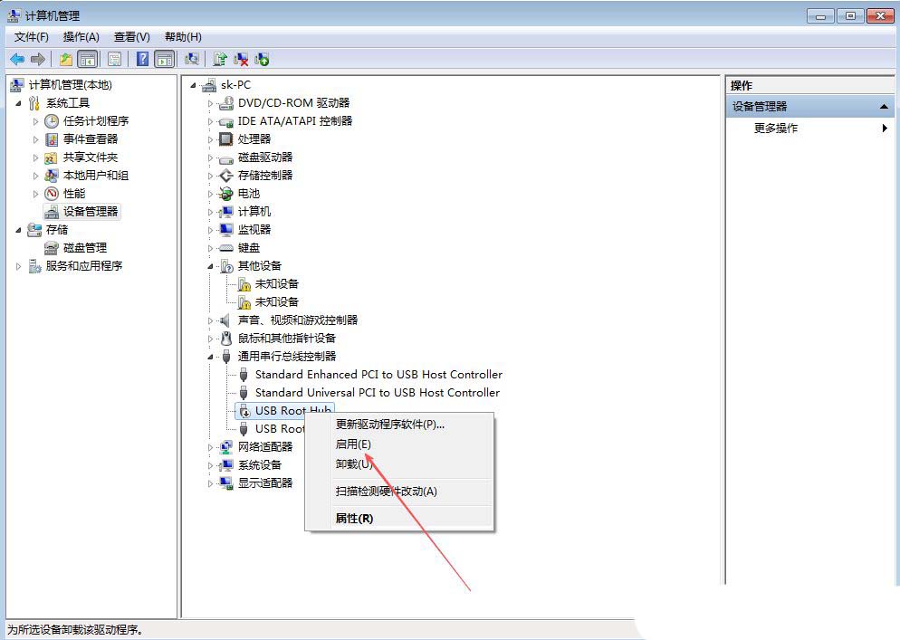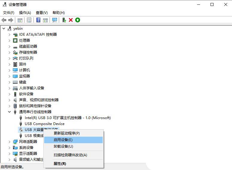 5、最后,再右键点击此设备,选择“启用”,重新插入usb设备即可;