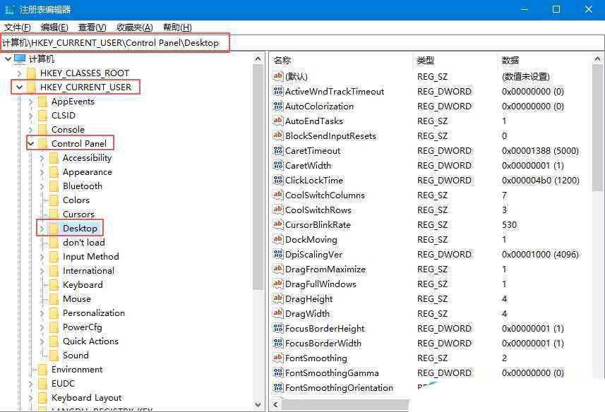 2、接着,在打开的界面中,依次点击打开“hkey_current_usercontrol paneldosktop”。