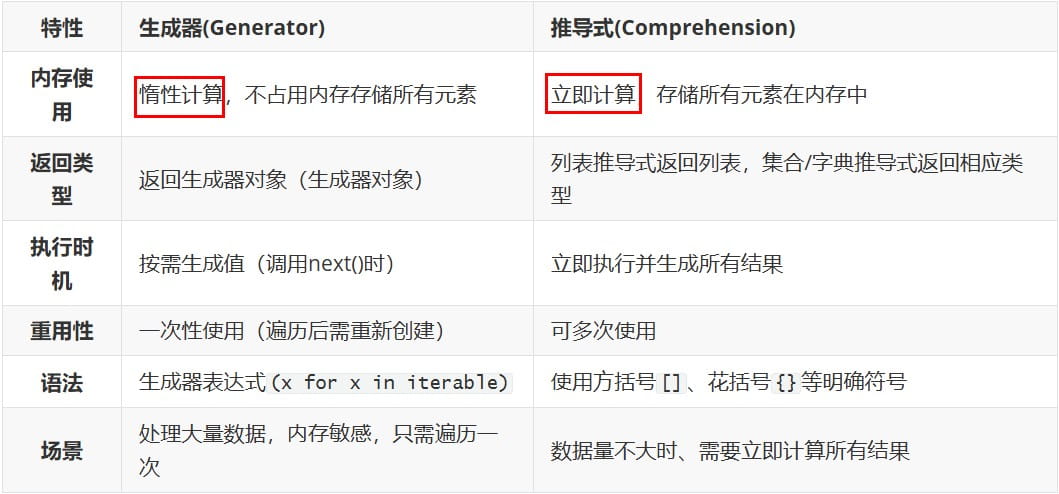 | 列表推导式 | [expr for item in iterable] | list(立即求值,占内存) |
