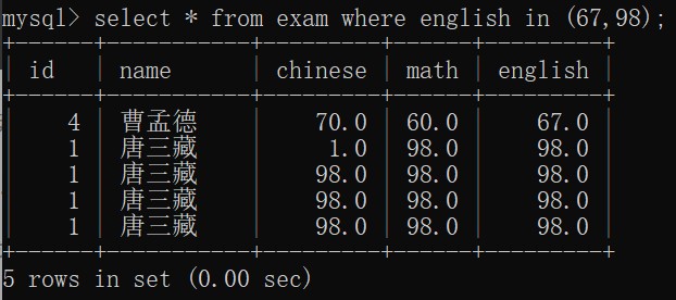 只查找在()里面的数据,只查找英语成绩为67和98的数据