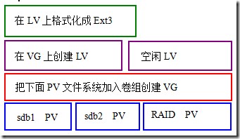 - 物理卷按大小相等的“块”为单位存储,块的大小与卷组中逻辑卷块的大小相同。