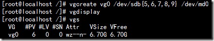 命令:vgcreate vg0 /dev/sdb{5,6,7,8,9} /dev/md0