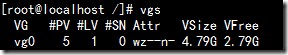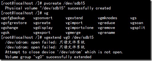 - vgextend vg0 /dev/sdb15 ———— 把sdb15加入到卷组vg0中