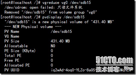 命令:vgreduce vg0 /dev/sdb15 ———— 从vg中删除pv