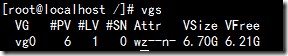 查看整个卷组vg总大小6.7g,剩余的空间为6.21g
