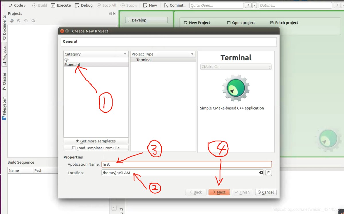 1.选standard, 2.选择工程保存路径,3.填写工程名称, 4.点next完成